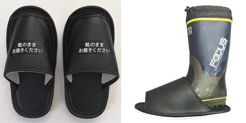 土足禁止などの場所へ、安全靴等の作業靴や長靴をはいたまま歩くことができるジャンボスリッパです。主に現場と土足禁止場所との行き来に便利につかえ、住宅、マンション展示場、施設、学校等の物品搬入、建設現場の事務所など、あらゆる場所で使われています。