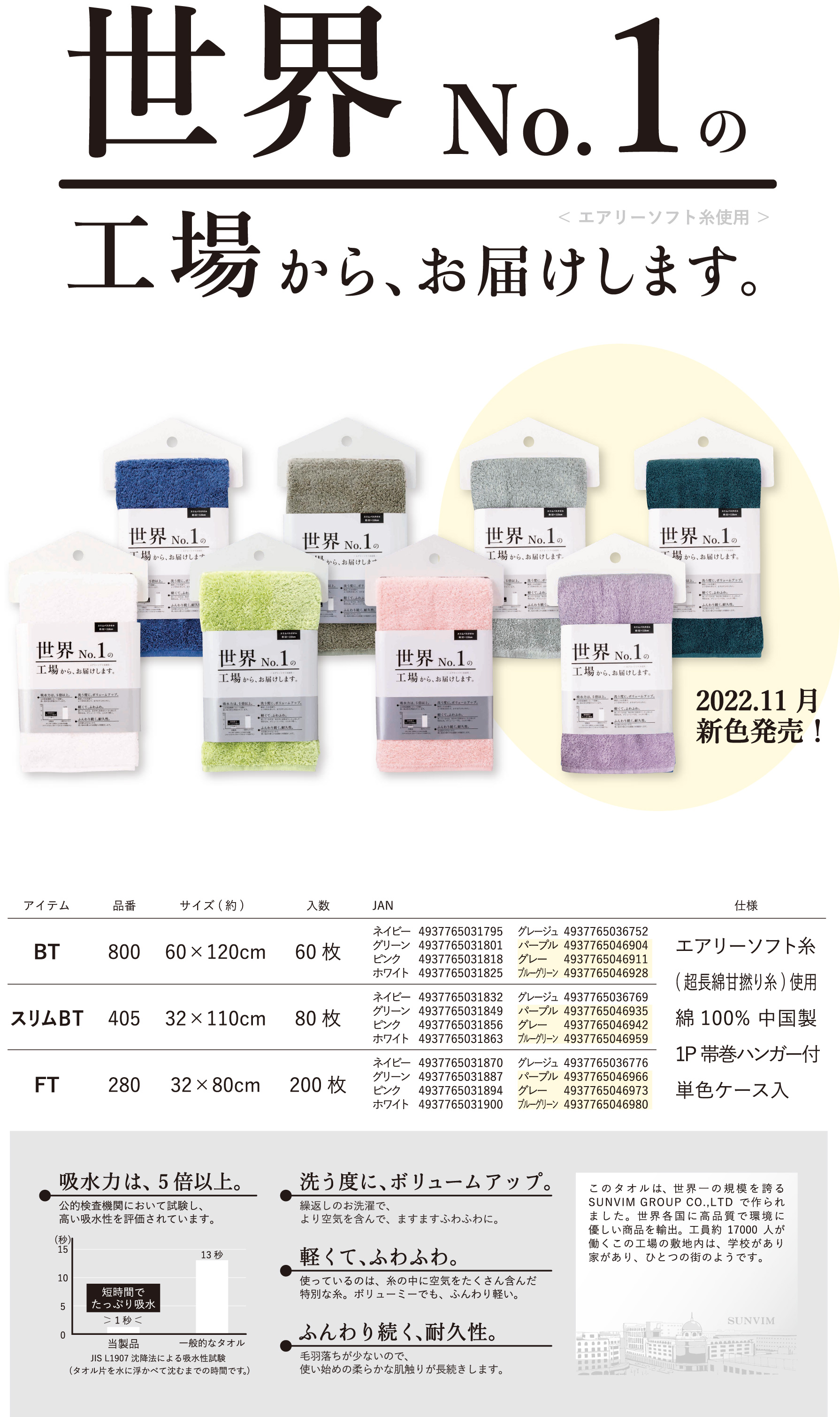 通常よりも繊維をゆるく撚っているためふわふわな触り心地のタオルですが、毛羽落ちは一般的なタオル基準の50%以下と少なく、気持ちよく快適に使える製品です。また、吸水に関しても、速度・量ともに一般的なタオルの5倍を実現しています。