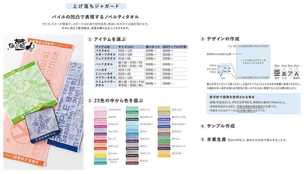 ※ハンドタオル、ハンカチ、スリムマフラーは300枚~の対応となります。