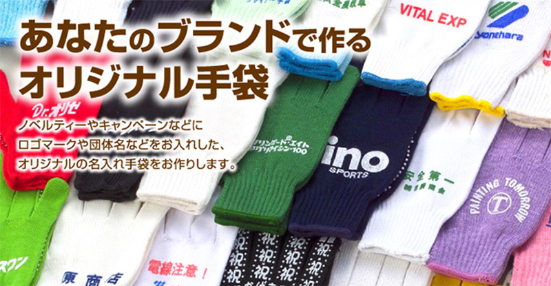 ロゴや各種文字を入れた「オリジナル手袋」も取り扱っています。ノベルティとして多くの方へお配りする際に普通サイズの手袋、ピッタリフィット手袋、のびーる手袋まで、バラエティーにとんだラインナップで、カラー展開も豊富です。印刷はなんと手の甲部分および指部分も含み手の平全体まで可能!ご希望のデザインでオリジナル手袋を作りませんか?
